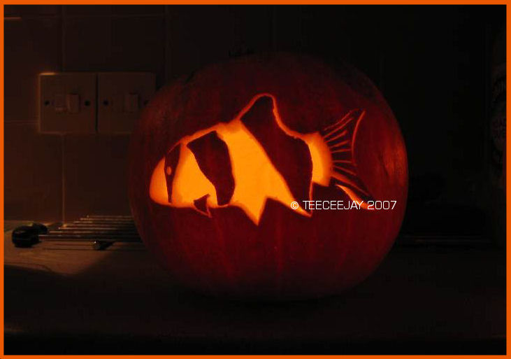 Clown loach carved into a halloween pumpkin.